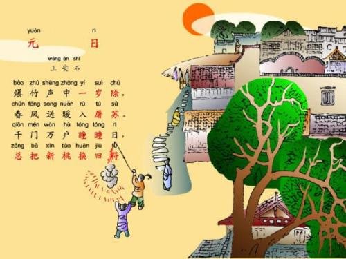 首句“爆竹声中一岁除”,在阵阵鞭炮声中送走旧岁,迎来新年。起句紧扣题目,渲染春节热闹欢乐的气氛。次句“春风送暖入屠苏”,描写人们迎着和煦的春风,开怀畅饮屠苏酒。第三句“千门万户曈曈日”,写旭日的光辉普照千家万户。用“曈曈”表现日出时光辉灿烂的景象,象征无限光明美好的前景。结句“总把新桃换旧符”,既是写当时的民间习俗,又寓含除旧布新的意思。“桃符”是一种绘有神像、挂在门上避邪的桃木板。每年元旦取下旧桃符,换上新桃符。“新桃换旧符”与首句爆竹送旧岁紧密呼应,形象地表现了万象更新的景象。王安石既是政治家,又是诗人。他的不少描景绘物诗都寓有强烈的政治内容。本诗就是通过新年元旦新气象的描写,抒写自己执政变法,除旧布新,强国富民的抱负和乐观自信的情绪。