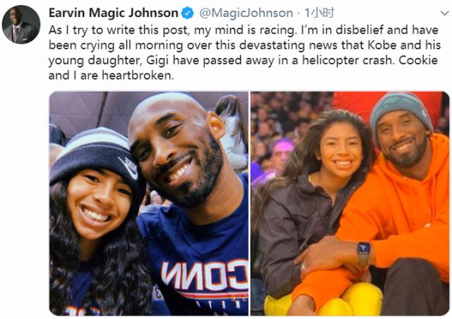 魔术师:就在我写这条推特的时候,我的头脑还是一团乱麻。听到科比和他的年轻女儿Gigi在一场直升机坠毁事故中去世的噩耗,我无比震惊,痛哭了一上午。Cookie(魔术师妻子)和我悲痛欲绝。我爱他,爱他的家人,爱他在球场内外所代表的意义。我的朋友,一位传奇,丈夫,父亲,儿子,奥斯卡奖得主以及湖人队史最伟大球员去世了。很难接受这件事。科比是我们篮球比赛的一位领袖,也是男女球员的精神导师。