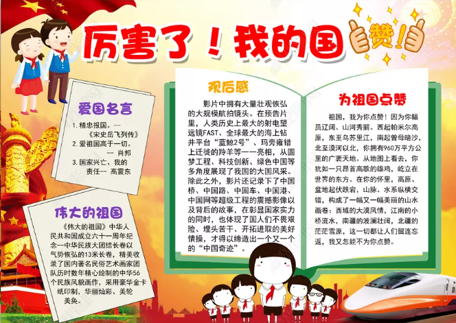 改革开放富起来,祖国声威震宇寰。改革圆了强国梦,美好生活续诗篇。祖国风雨数十载,开创美好新时代。中华全民齐奋进,追求卓越创辉煌。2020国庆节,厉害了,我的国。下面是小编为大家整理的国庆节手抄报,欢迎大家欣赏和借鉴,希望大家喜欢!
